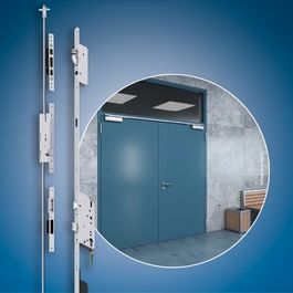 Beispielhaft präsentiert FUHR hierzu eine zweiflügelige Funktionstür, ausgestattet mit autotronic 836PK. Die Automatik-Mehrfachverriegelung mit motorischer Öffnung, Panikfunktion und Schaltkontakten ermöglicht diverse Zustandsabfragen zur Integration in Einbruchmeldeanlagen, Fluchtwegsicherungs- oder Gebäudemanagementsysteme.