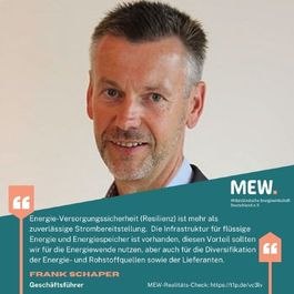 Frank Schaper, Geschäftsführer des MEW, bedauert dieses: „Energie-Versorgungssicherheit (Resilienz) ist mehr als eine zuverlässige Strombereitstellung. Die Infrastruktur für flüssige Energie und Energiespeicher ist vorhanden, diesen Vorteil sollten wir für die Beschleunigung und vor allem für die Absicherung des Übergangs von fossilen auf erneuerbare Energien und darüber hinaus nutzen, auch im Zusammenhang mit den Notwendigkeiten zur Diversifikation der Energie- und Rohstoffquellen sowie der Lieferanten.“ Die Nutzung vorhandener Infrastrukturen ist darüber hinaus gesamtwirtschaftlich mehr als geboten angesichts der massiven Investitionen, die uns in den kommenden Dekaden erwarten.