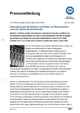 Die TÜV SÜD Industrie Service GmbH unterstützt Planer, Errichter und Betreiber von Rechenzentren mit einem umfangreichen Leistungsspektrum. Im Mittelpunkt stehen Zertifizierungen von Rechenzentren nach den Normen DIN EN 50600 und ISO/IEC 22237, die in einem ganzheitlichen Ansatz die Anforderungen an die Sicherheit und Verfügbarkeit von Rechenzentren beschreiben. Ergänzt werden diese Zertifizierungen durch Bewertungen der Nachhaltigkeit von Rechenzentren nach dem europäischen Data Center Maturity Model (DCMM) und nach der Konformität mit der Taxonomie-Verordnung der Europäischen Kommission. Die Leistungen für die Mieter von Rechenzentren umfassen unter anderem die Bewertung der Infrastruktureinrichtungen, der physischen Sicherheit, der Erfüllung von Nachhaltigkeitszielen und der BCM/DR-Fähigkeit der angemieteten Rechenzentren.