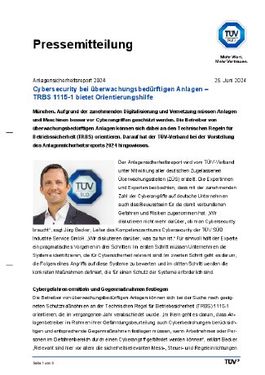 München, 25.06.2024 (PresseBox) - Aufgrund der zunehmenden Digitalisierung und Vernetzung müssen Anlagen und Maschinen besser vor Cyberangriffen geschützt werden. Die Betreiber von überwachungsbedürftigen......