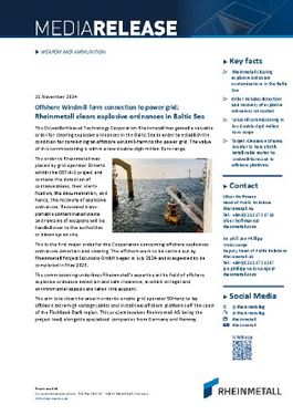 Düsseldorf, 21.11.2024 (PresseBox) - The Düsseldorf-based Technology Corporation Rheinmetall has gained a valuable order for clearing explosive ordnances in the Baltic Sea in order to establish the condition for connecting an offshore windmill-farm to the power grid. The value of this commissioning is within a low double-digit million Euro range.
