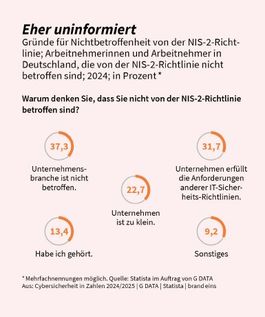Rund 30.000 Unternehmen sind von den Vorgaben der NIS-2-Richtlinie direkt betroffen. Und damit deutlich mehr als durch andere Regularien. Auch hier zeigt die Studie von G DATA, dass viele Arbeitnehmende immer noch schlecht informiert sind: Fast 40 Prozent der Befragten geben an, dass ihr Unternehmen zu einer Branche gehört, die von NIS-2 nicht betroffen ist. Jede und jeder Dritte gibt zudem an, dass die eigene Firma die Vorgaben anderer IT-Sicherheitsrichtlinien erfüllt. Mehr als 22 Prozent sehen die geringe Unternehmensgröße als Grund dafür, dass der Betrieb nicht unter NIS-2 fällt. Dabei vergessen viele, dass zahlreiche Firmen auch indirekt von NIS-2 betroffen sein werden, denn die Direktive fordert eine Absicherung der gesamten Lieferkette. So sind auch Unternehmen aus anderen Branchen oder kleinere Betriebe zur Umsetzung gezwungen.