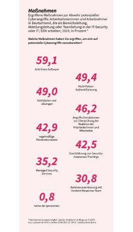 Bochum, 05.06.2025 (PresseBox) - Die Mehrheit der deutschen IT- und Sicherheitsverantwortlichen in Unternehmen vertraut bei der Abwehr potenzieller Cyberangriffe auf Antiviren-Software. Das zeigt die aktuelle Studie „Cybersicherheit in Zahlen“ von G DATA CyberDefense in Zusammenarbeit mit Statista und Brand eins. Neben klassischen Maßnahmen setzen viele Firmen auch auf Multi-Faktor-Authentifizierung, Notfallpläne und -übungen sowie Angriffssimulationen.