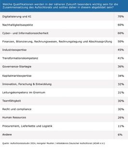 Aktuelle Governance-Analysen zeigen eindeutig, wie sich die Anforderungen an Aufsichtsräte verschieben. Die jüngste Aufsichtsratsstudie 2024 von Hengeler Mueller und dem Arbeitskreis Deutscher Aufsichtsrat (AdAR) unterstreicht, welche Kompetenzen in den kommenden Jahren besonders gefragt sein werden: Digitalisierung und KI dominieren mit großem Abstand, gefolgt von Nachhaltigkeit, Cyber- und Informationssicherheit sowie fundierter Finanz- und Prüfungskompetenz. Das Kompetenzprofil wird damit breiter, technischer und strategischer zugleich. Die Grafik macht sichtbar, wie stark Zukunftsfelder das Anforderungsgefüge bereits heute prägen. Die Kompetenz der Zukunft wird damit nicht länger als reine Fachlichkeit verstanden – sondern als Fähigkeit, aus komplexen technologischen und gesellschaftlichen Entwicklungen unabhängige, verantwortungsvolle Entscheidungen abzuleiten. Urteilskraft als Profession.